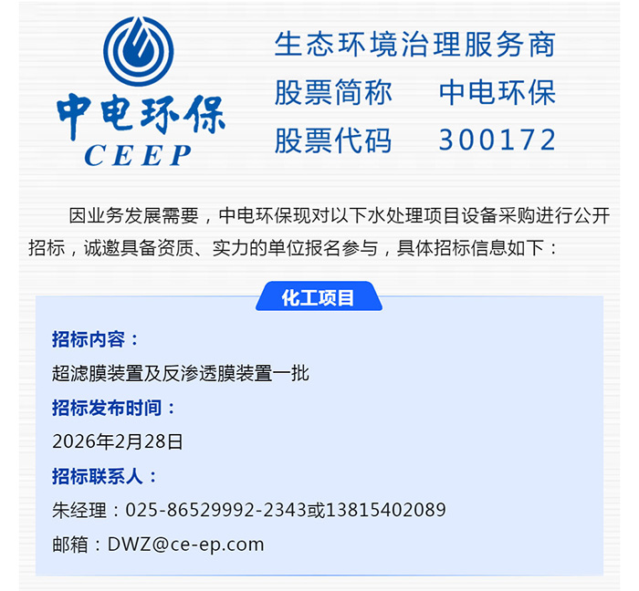 中電環(huán)保股份有限公司是南京市首家環(huán)保上市公司(股票簡稱:中電環(huán)保,股票代碼:300172),南京環(huán)保產業(yè)協(xié)會會長單位,國家級聯(lián)盟理事長單位,是生態(tài)環(huán)境治理服務商,主營(3+1):水務、固危廢、煙氣治理及產業(yè)創(chuàng)新平臺,包括:工業(yè)水處理、污水處理及水環(huán)境綜合治理;固危廢土壤、污泥餐廚垃圾處理;煙氣及VOCS治理;智慧環(huán)保;高端裝備等。